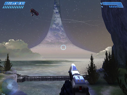 Now a real player in the burgeoning gaming industry, Bungie Software took the stage at 1999’s Macworld Expo with, then interim CEO, Steve Jobs to announce to the world a new third person shooter for Windows and Mac titled Halo: Combat Evolved. Advertising no levels or breaks in gameplay, Halo planned to give players complete freedom of movement over open terrain. Players were to expect vast outdoor vistas, complete with flora, fauna, weather and celestial events, that were complemented with indoor environments of comparable detail and complexity. A universal physics model and persistent objects were to make events in this world utterly convincing. In this open environment, gameplay would not be linear but would unfold in response to the player’s actions.